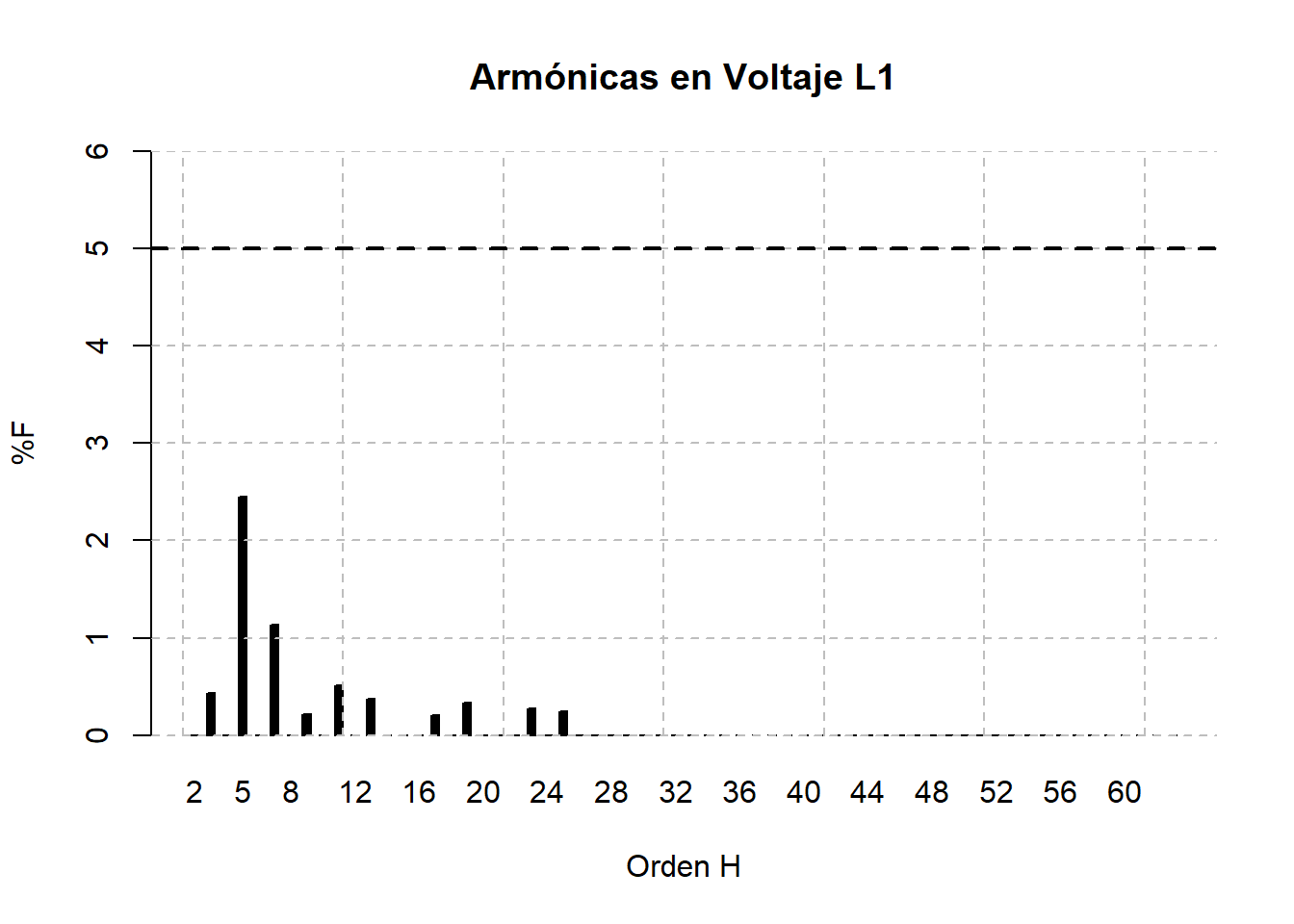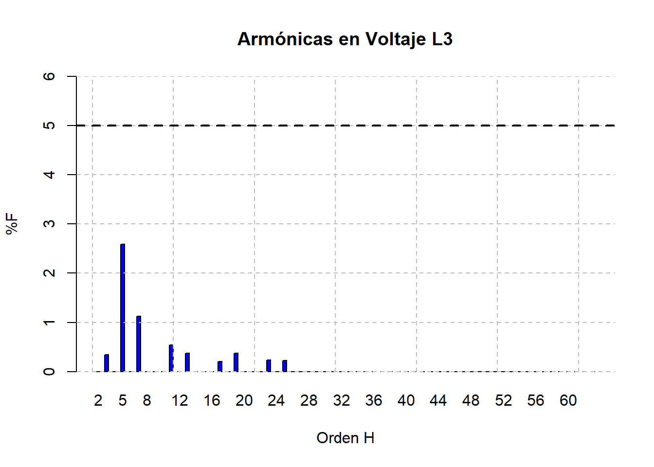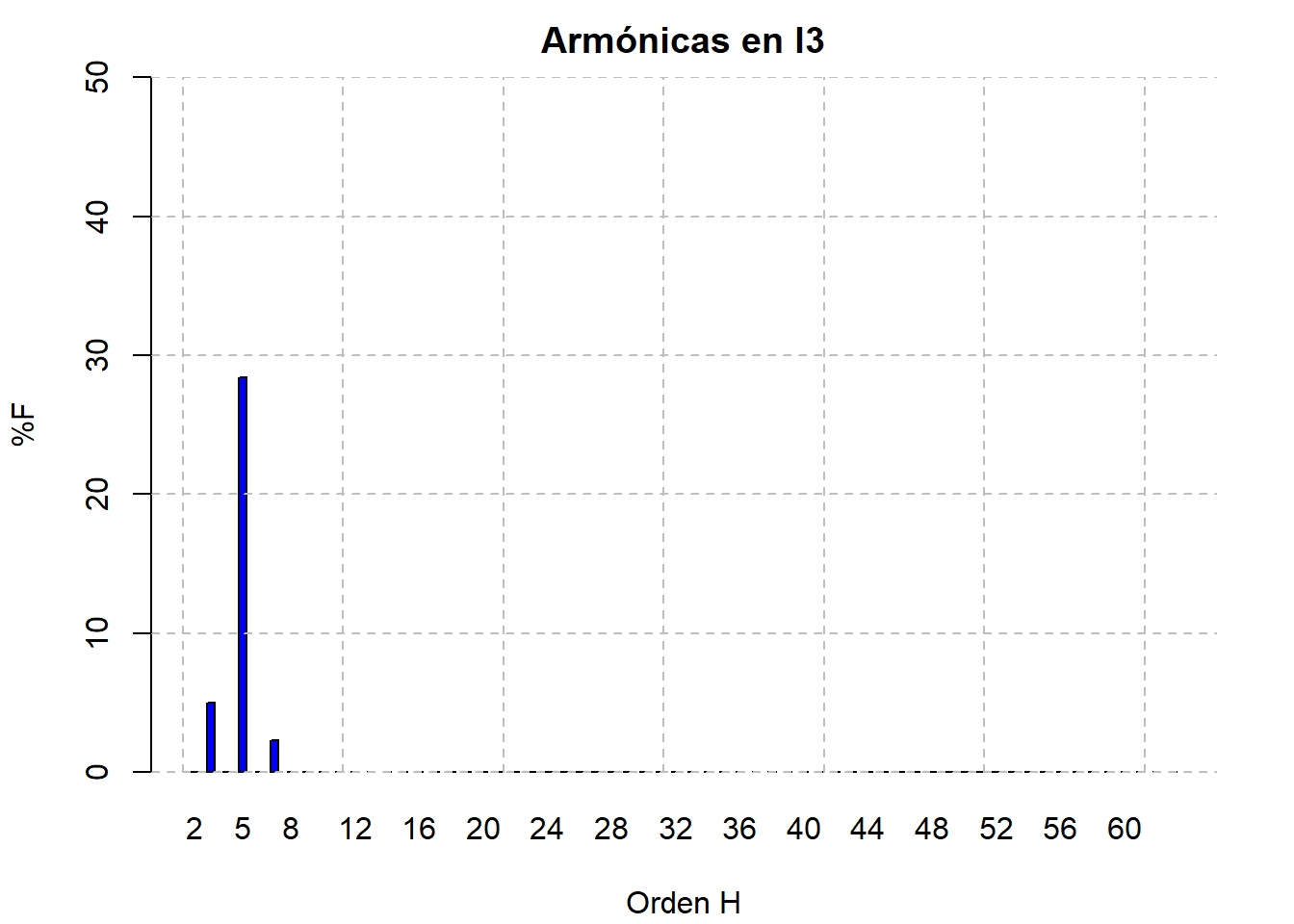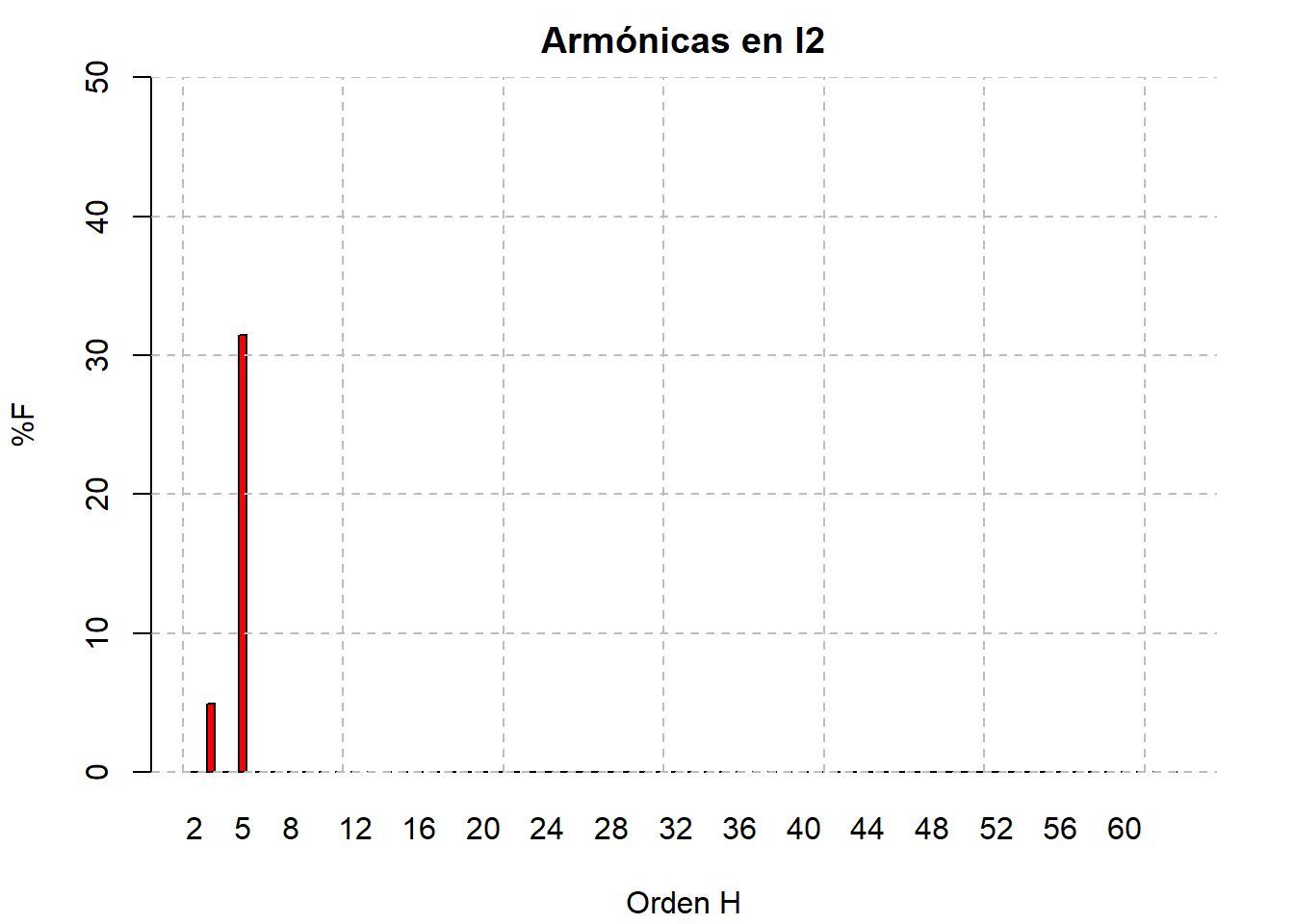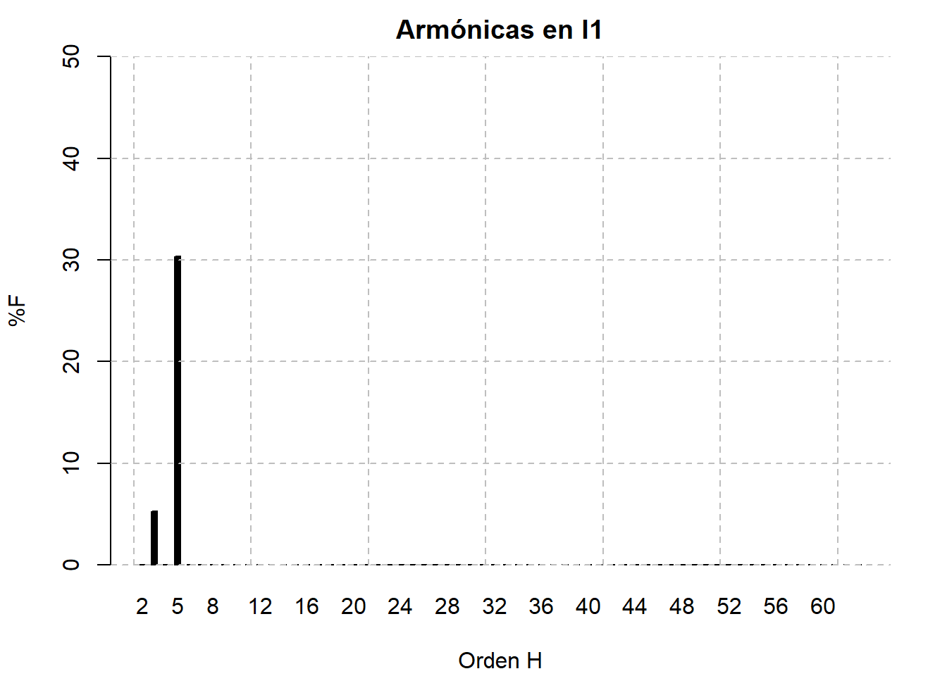 La distorsión total armónica de la corriente alcanza valores de hasta el 50%, principalmente debido a la armónica 5ª que alcanza valores del 30% de la fundamental, es importante considerar un reactor de rechazo (si es que no lo tiene) en los bancos de capacitores.